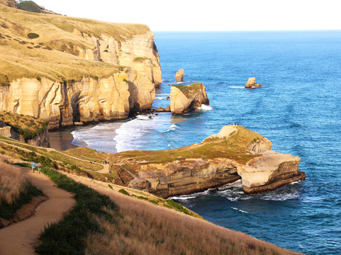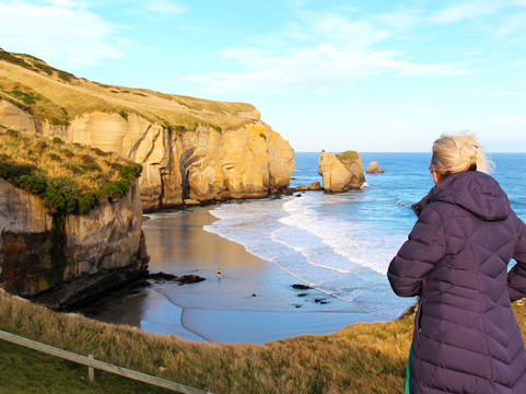 翻译:从达尼丁市中心乘坐优步只需十分钟即可抵达隧道海滩,仿佛置身于另一个世界,一个饱经风霜、被时间与潮汐雕琢的世外桃源。我们特意选择在退潮时分前往,得以沿着手工雕刻的石隧道缓缓而下,隧道共有七十二级台阶,呈螺旋状向下延伸,直至抵达水边。太平洋波涛汹涌,海浪拍打着高耸的砂岩峭壁,穿过经年累月被盐分和海风侵蚀得光滑的拱形岩层。沿着小径缓缓向下,便可欣赏到令人叹为观止的海岸风光——风化的岩层如同古老的哨兵般耸立,无垠的海洋在它们之外绵延不绝,呈现出无尽的蓝色。海蚀洞、雄伟的天然拱门以及落日的金色光芒,为这片景色增添了一份静谧的庄严。隧道海滩是那种能让人彻底谦卑的罕见之地。站在悬崖之下,当夕阳的余晖洒在海面上时,我感到自己无比渺小,并深深地爱上了这片神奇的世外桃源。