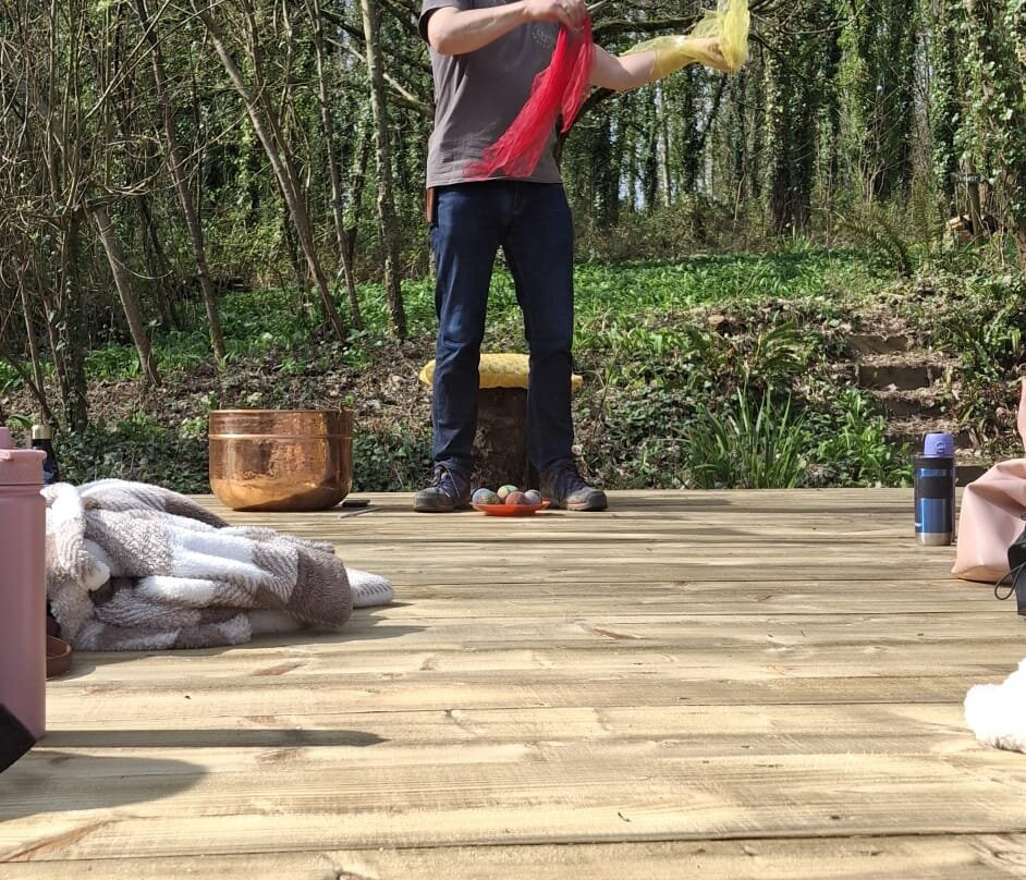 Robin has created a place of sanctuary. With quirky things hidden along the way. It’s almost like something out of Alice in wonderland. He had just finished creating a stage come seating area which worked perfectly for our group.