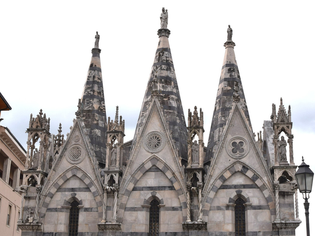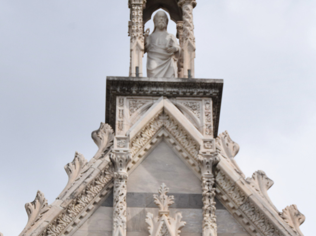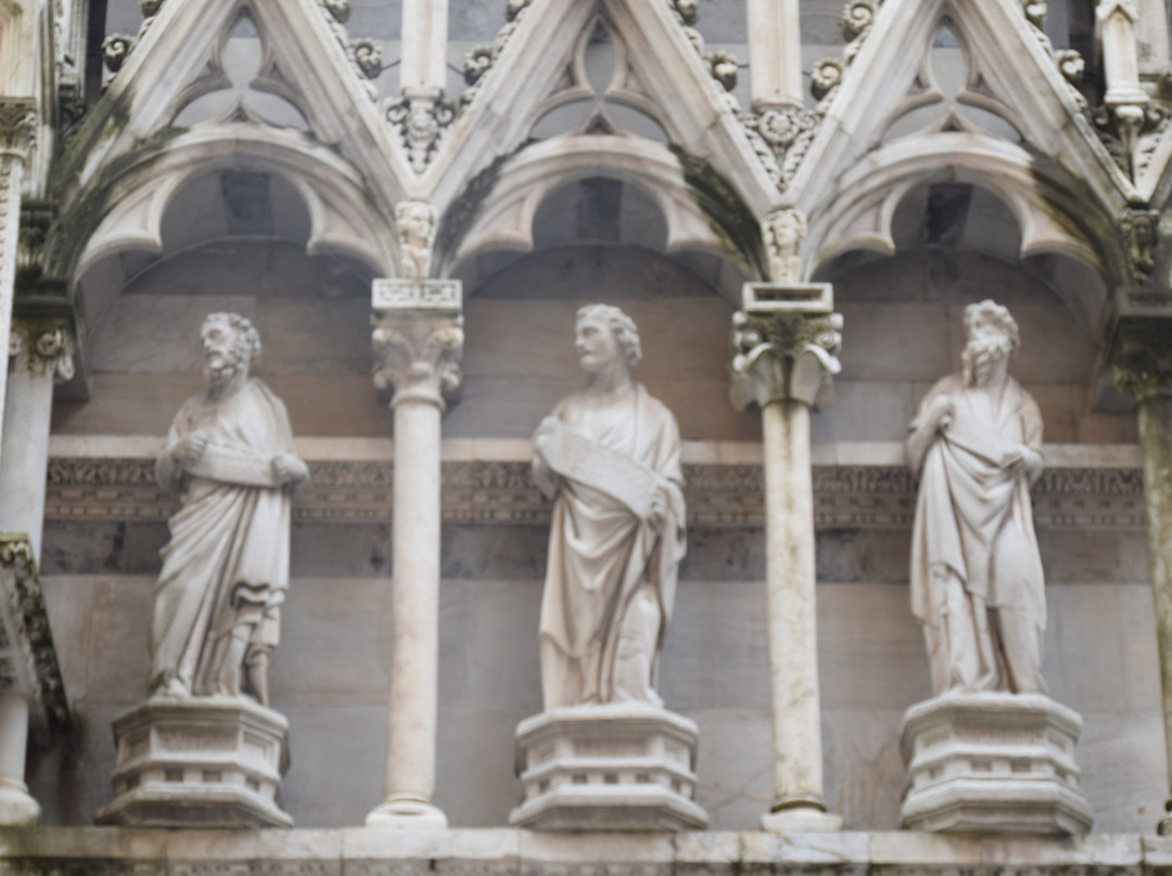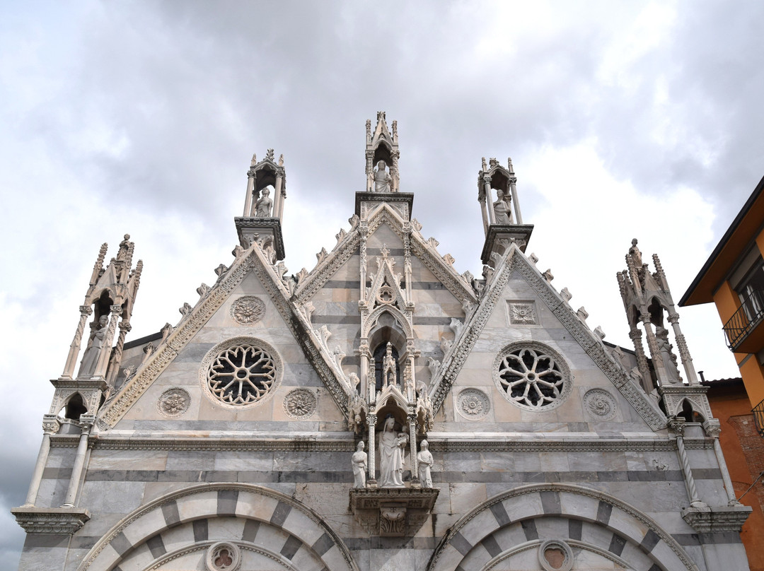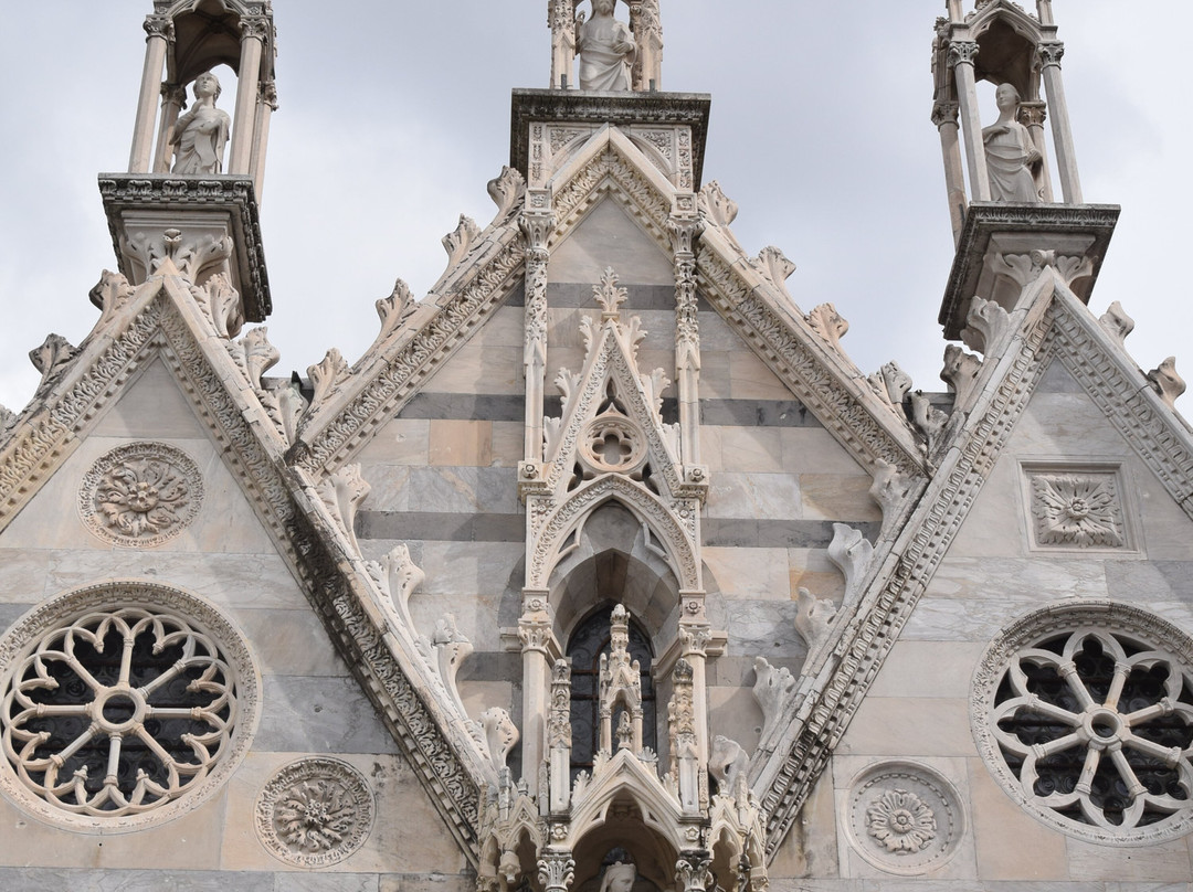 教堂外观装饰繁复,遍布14世纪比萨工匠创作的雕像、圣龛、尖拱、镶嵌画和玫瑰花窗,其中最著名的无疑是安德烈亚·皮萨诺及其子尼诺·皮萨诺和乔瓦尼·迪·巴尔杜乔。