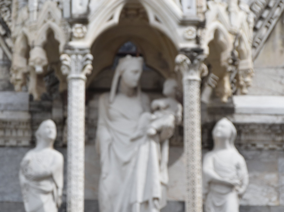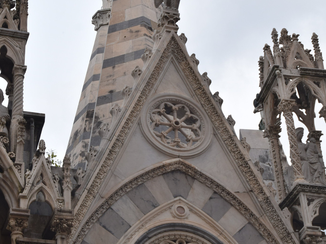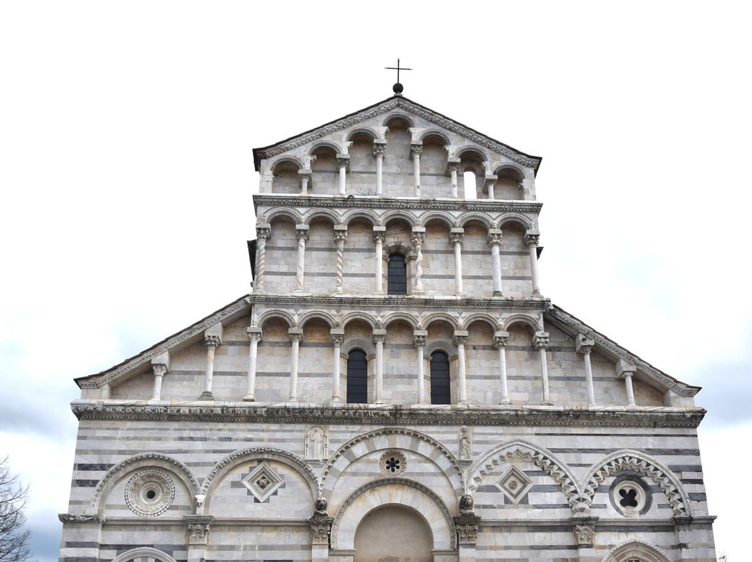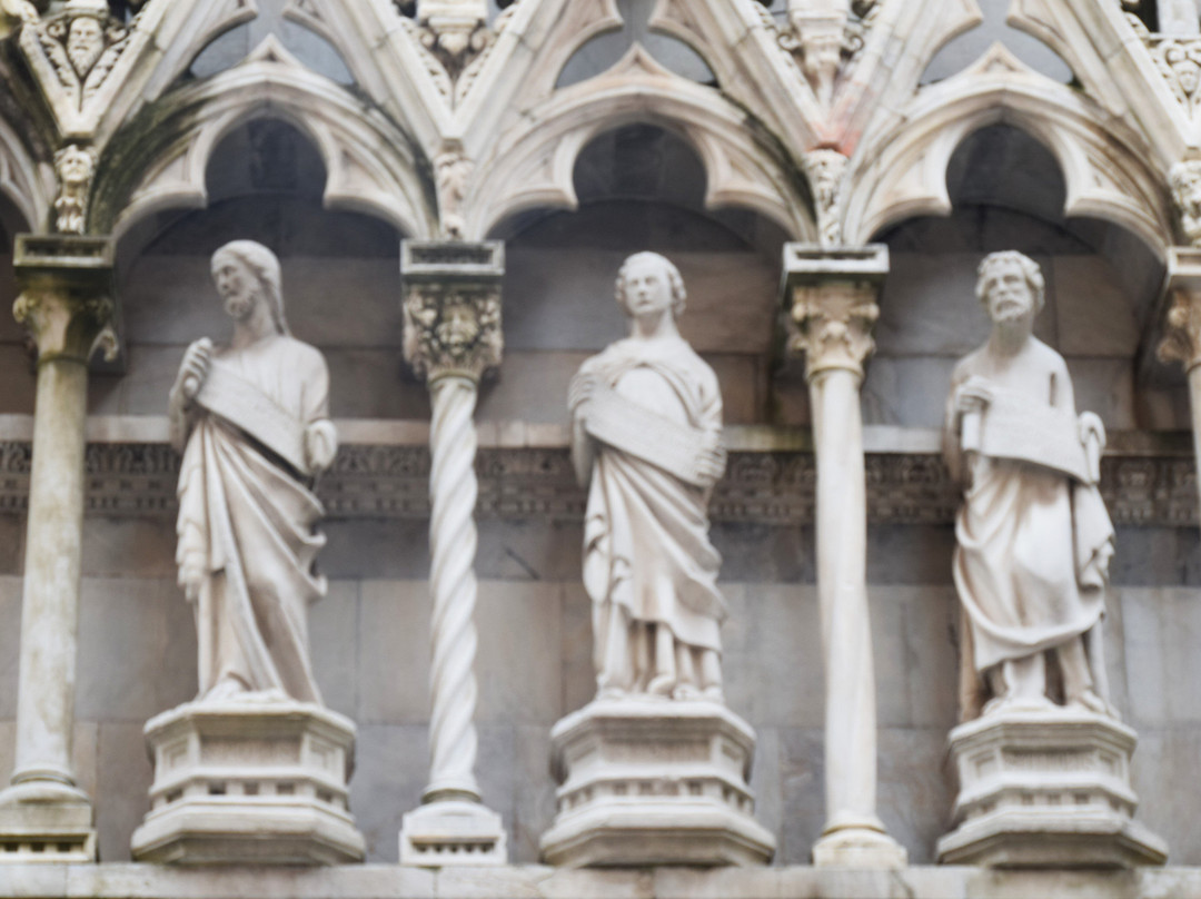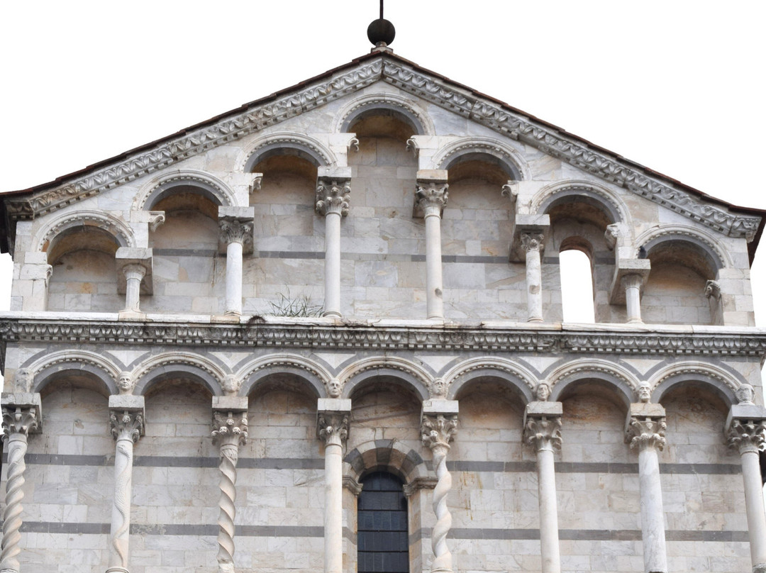 教堂外观装饰繁复,遍布14世纪比萨工匠创作的雕像、圣龛、尖拱、镶嵌画和玫瑰花窗,其中最著名的无疑是安德烈亚·皮萨诺及其子尼诺·皮萨诺和乔瓦尼·迪·巴尔杜乔。