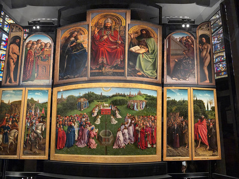 祭坛画被放置在玻璃罩内,不仅是为了保护它免受环境侵蚀,也是为了防止再次被盗。由于下部画板近期完成了修复,祭坛画的大部分色彩鲜艳,细节清晰可见。上部画板则是高分辨率复制品(原作目前仍在根特美术博物馆(MSK)修复中)。不要只看正面,也应该绕到侧面欣赏更多画作。当祭坛画两侧的玻璃罩关闭时,这些画作就会出现在正面。