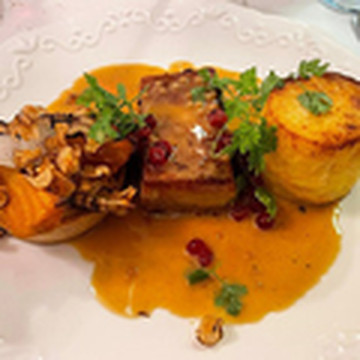 Ballotine af Gram Slot kvæg. Glaserede majroe - kålskud - grønkål - rosenkå l- luftig kartoffelmos.